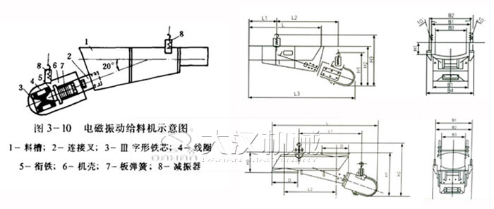 主要由料槽、電磁激振器、減振器組成。激振器又由電磁鐵(鐵芯和線圈)、銜鐵和裝在兩者之間的主振彈簧等構(gòu)成,是產(chǎn)生振動的激振源,激振器的工作可以通過一定的控制裝置進(jìn)行控制。