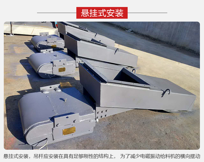 電磁振動(dòng)給料機(jī)一般采用懸掛式安裝,吊桿應(yīng)安裝在具有足夠剛性的結(jié)構(gòu)上, 為了減少電磁振動(dòng)給料機(jī)的橫向擺動(dòng), 懸掛吊桿應(yīng)向外張開 10°左右布置。對于大型給料機(jī), 為了維修和更換料槽方便,還應(yīng)設(shè)置移動(dòng)滑架。