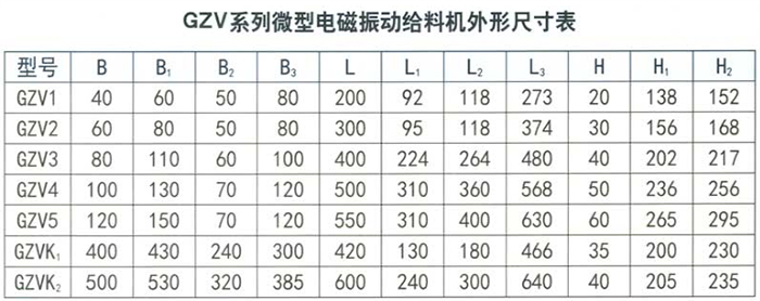 注:GZV微型電磁振動給料機一共有七種規(guī)格,包含GZVK微型電磁振動給料機兩種規(guī)格,它是在GZV型號的基礎(chǔ)上,根據(jù)用戶的要求而開發(fā)的新型產(chǎn)品。它不僅具有GZV的性能和特點,其結(jié)構(gòu)和原理也都一樣,而且生產(chǎn)能力大給料均勻平穩(wěn)。