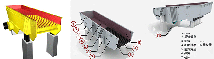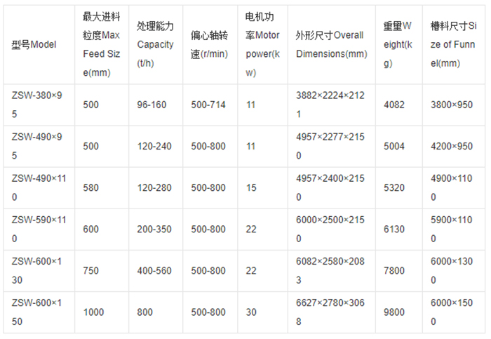 ZSW振動給料機(jī)主要由振動機(jī)架、彈簧、振動器、電機(jī)振動架及電機(jī)等組成。激振器個(gè)是由二特定位置的偏心軸以齒輪相嚙合組成,裝配時(shí)必須使兩齒輪按標(biāo)記相嚙合,通過電機(jī)驅(qū)動,使兩偏心軸旋轉(zhuǎn),從而產(chǎn)生巨大合成的直線激振力,使機(jī)體在支承彈簧上作強(qiáng)制振動,物料則以此振動為動力,在料槽上作滑動及拋擲運(yùn)動,從而使物料前移而達(dá)到給料目的。當(dāng)物料通過槽體上的篩條時(shí),較小的料可通過篩條間隙而落下,可不經(jīng)過下道的破碎工序,起了篩分的效果,提高了工作效率。