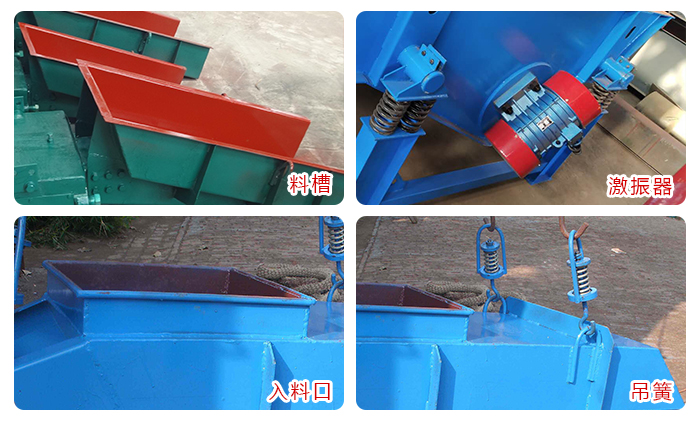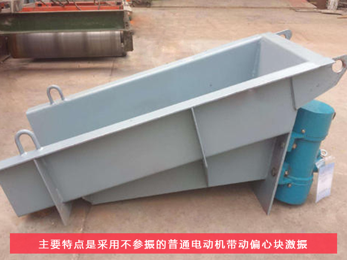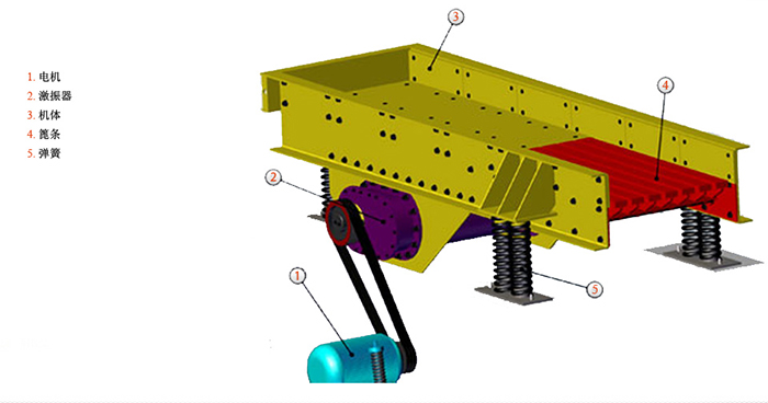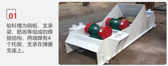 1.給料槽為鋼板、支承梁、筋坂等組成的焊接結(jié)構(gòu),兩端焊有4個(gè)托架,支承在彈簧支座上。振動(dòng)器為雙軸強(qiáng)迫同步的塊偏心振動(dòng)器,兩根軸上的偏心塊齒輪裝置保持反向旋轉(zhuǎn)。振動(dòng)器運(yùn)動(dòng)軌跡為與槽體成30度角的直線,給料機(jī)的入料端和出料端的運(yùn)動(dòng)軌跡呈扁平的橢圓形。